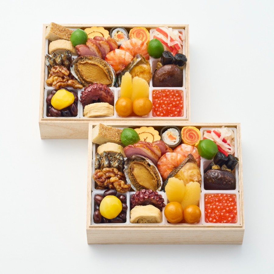 | 内容量 | 牛蒡信田巻、鳥味噌松風、若桃甘露煮、鮭年輪巻、日の出龍飛巻、合鴨ロース、伊達巻、南天いくら、昆布巻、椎茸旨煮、あわび旨煮、海老旨煮、鰆柚庵焼、紅白なます、数の子、金柑甘煮、田作り、胡桃甘煮、ぶどう豆、栗甘露煮、袱紗玉子、手繰り湯葉、たこ旨煮 一人前 × 二客組 |
