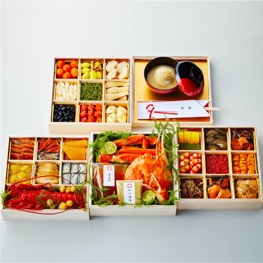 原材料 | 蒸し松葉蟹(国内製造)、伊勢海老塩茹、生姜酢、いくら醤油漬、いか黄身焼、栗きんとん、鮑柔煮、味付け数の子、平目龍皮巻、寒筍旨煮、生うに旨煮、丹波黒豆煮、棒鱈柔煮、梅人参煮、芽くわい煮、瓢千代呂木甘煮、海老芋含煮、酢橘、堀川牛蒡印籠煮、蛤しぐれ煮、車海老旨煮、大助焼(鮭、醤油、酒、みりん)、金箔唐墨、牛肉しぐれ煮、花弁百合根甘煮、蟹味噌、花山椒旨煮、金柑蜜煮、銀杏含煮、田作り(片口いわし、酒、みりん、その他)、火取りこのこ、 【別添品】白味噌雑煮(国内製造)、丸餅(国産米)、糸花鰹/保存料(安息香酸Na)、酸化防止剤(V.E、V.C)、着色料(カラメル色素、赤3、黄5、クチナシ、金箔)、酒精、香料、(一部にえび・かに・小麦・卵・あわび・いか・いくら・牛肉・さけ・大豆・やまいも・ゼラチンを含む) |