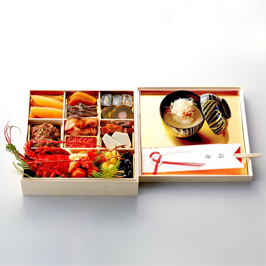 | 原材料 | 伊勢海老塩茹(国内製造)、芽くわい煮、いくら醤油漬、丹波黒豆煮、牛肉しぐれ煮、海老芋含煮、平目龍皮巻、金柑蜜煮、味付け数の子、堀川牛蒡印籠煮、大助焼(鮭、醤油、酒、みりん)、金箔唐墨、棒鱈柔煮、田作り(片口いわし、酒、みりん、その他)、梅人参煮、瓢千代呂木甘煮 【別添品】白味噌雑煮(国内製造)、丸餅(国産米)、糸花鰹/酸化防止剤(V.E、V.C)、着色料(カラメル色素、クチナシ、金箔、赤3、黄5)、酒精、(一部にえび・小麦・いか・いくら・牛肉・さけ・大豆・やまいも・ゼラチンを含む) |