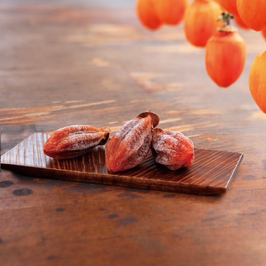各農家は上質な柿をつくるため土づくりや剪定、摘果、草刈りなど手間暇をかけ果実を育てます。そして、収穫時には柿の皮を一つ一つ丁寧に剥ぎ、柿小屋と呼ばれる専用の建物に干していきます。干された柿は淡い初冬の日差しを受け天日乾燥や補助乾燥などの工程を経てほし柿へと姿を変えていきます。