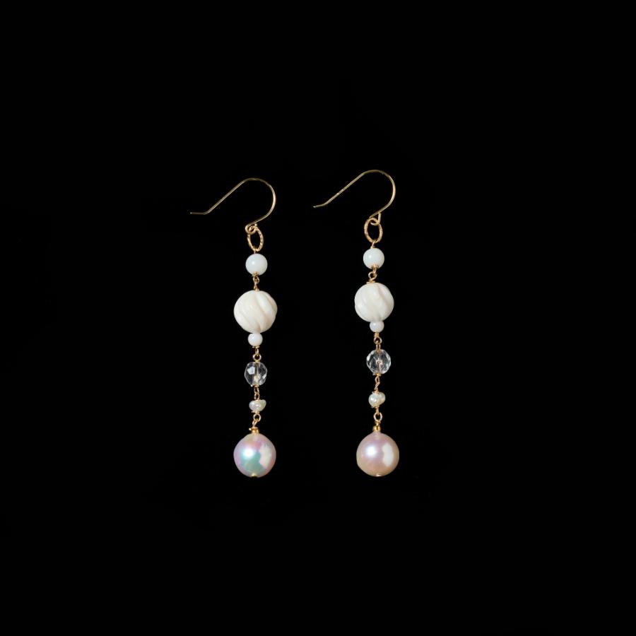 高知県産白珊瑚、愛媛県宇和島産あこや真珠、水晶、K14 ゴールドフィルドワイヤー、ピアス部K18