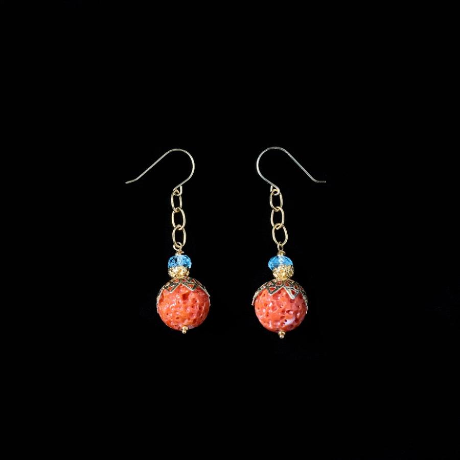 高知県産赤珊瑚、アクアマリン、フランス製真鍮金メッキ金具、K14 ゴールドフィルドチェーン、ピアス部K18