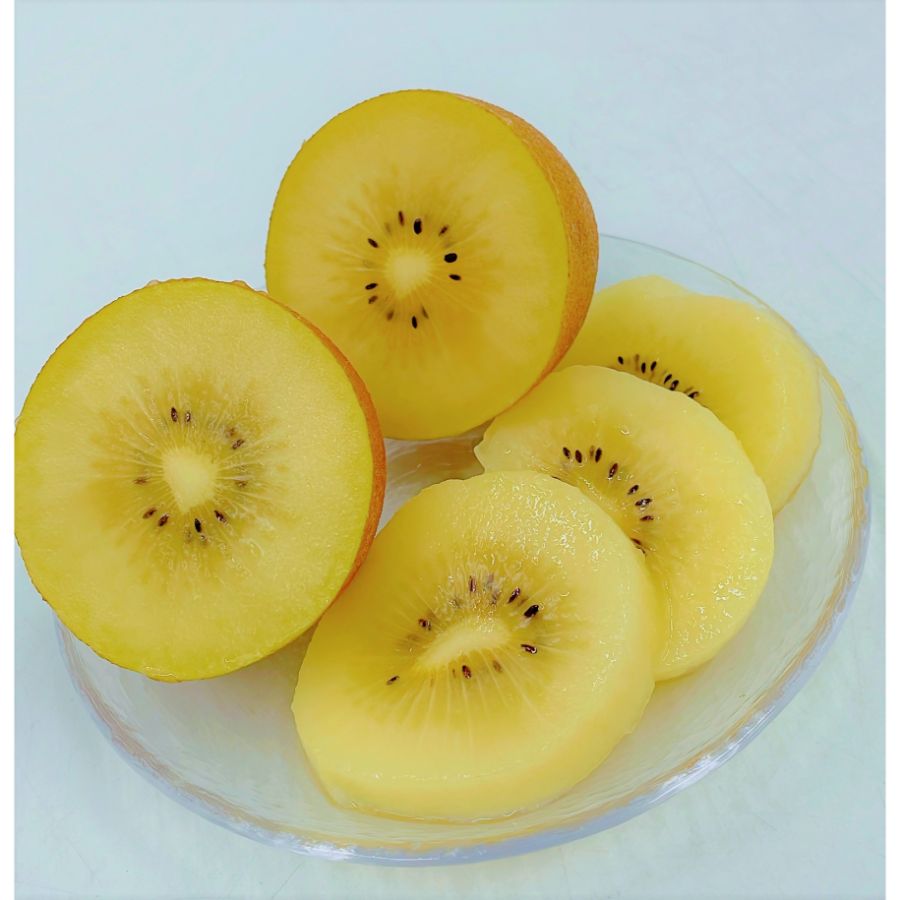 サンゴールドキウイは果肉の色は緑が弱く黄色っぽい色をしていてジューシーで柔らかく、グリーンよりも酸味が少なくジューシーな甘さと程よい酸味のバランスが良いのが特長です。