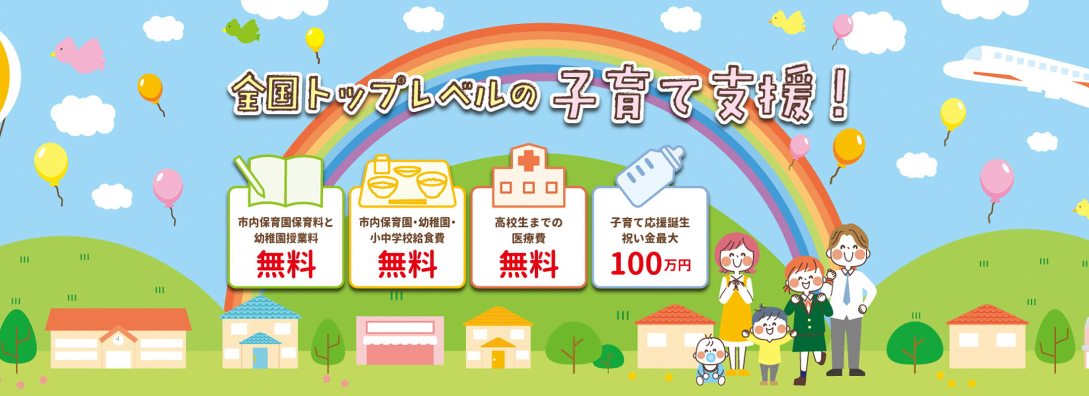 「高校生までの医療費無料化」「幼稚園・小学校・中学校の給食費の無料化」「市内保育園の保育料・市内幼稚園の授業料の完全無料化」「最大100万円の子育て誕生祝い金制度」など全国トップレベルの子育て支援に加え、市民の講師で組織する公営の無料塾「学びの21世紀塾」や先輩ママたちで子育てをサポートする「アンジュママン」など、市民総ぐるみで子育てしやすく、充実した教育環境づくりに取り組んでいます。