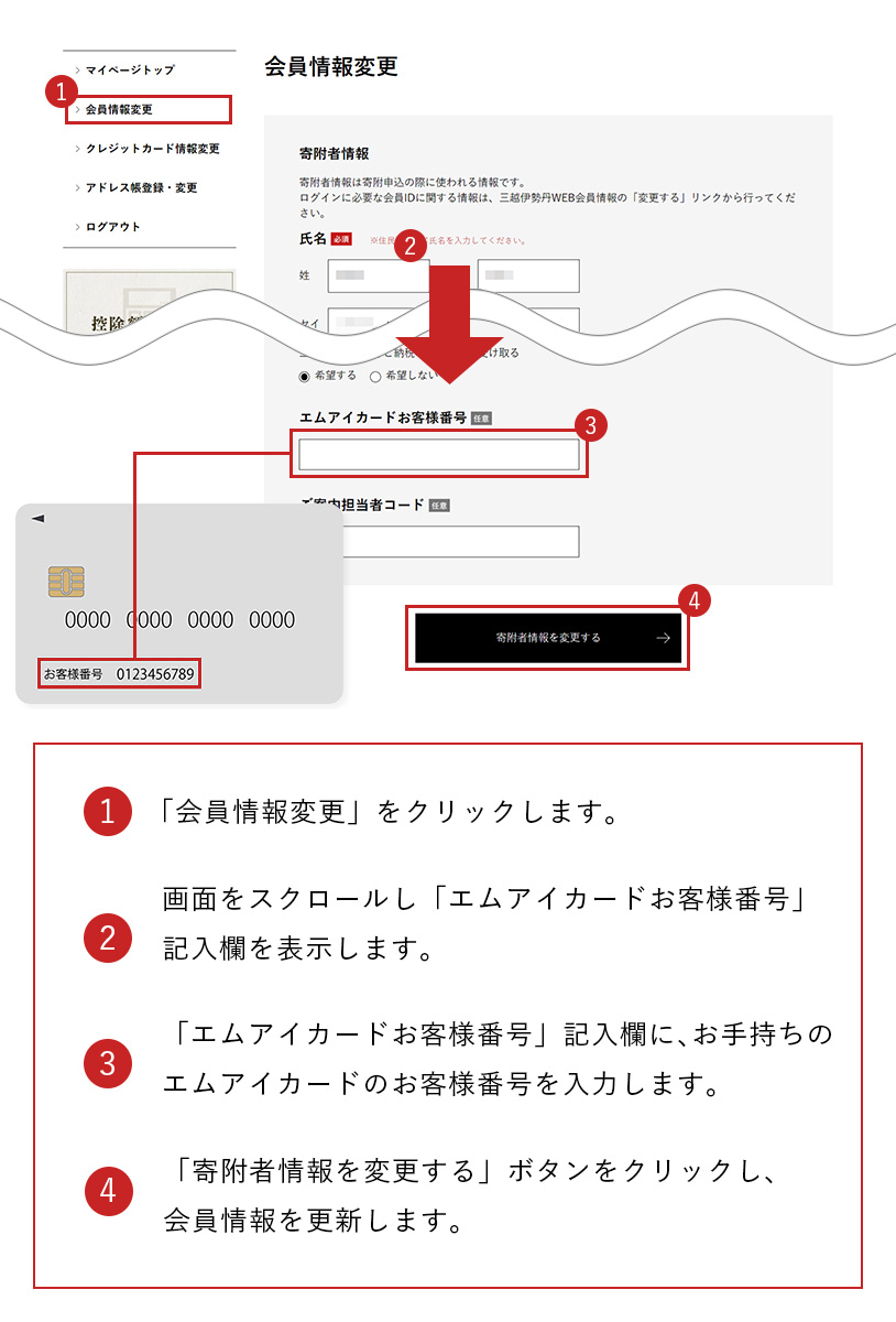 お手数ではございますが、下記手順をご覧の上、「エムアイカードお客様番号」のご登録をお願いいたします。