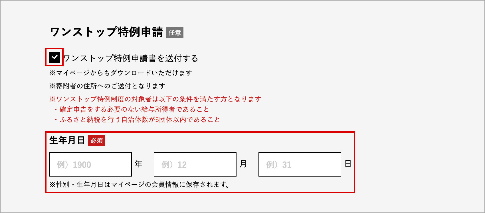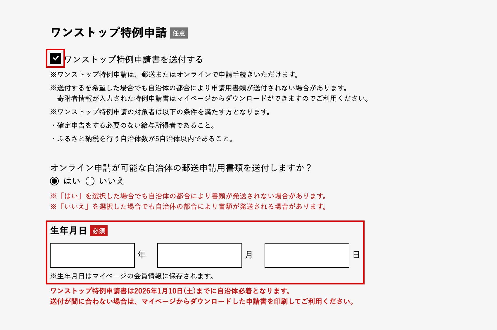 ふるさと納税の寄附金控除を受ける目的以外で所得税や住民税の申告を行う必要がない場合、チェックを入れてください。 - 寄附先が年間で5自治体以内であると見込まれる方はチェックを入れてください。(寄附回数ではなく、寄附する自治体数)