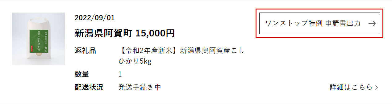 ②マイページの寄附履歴の「ワンストップ特例 申請書出力」をクリック
