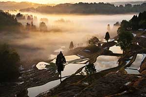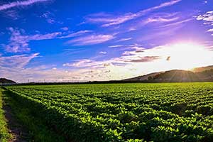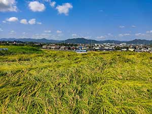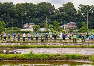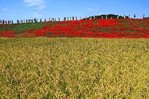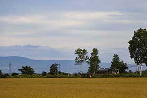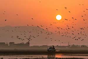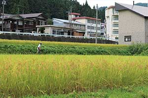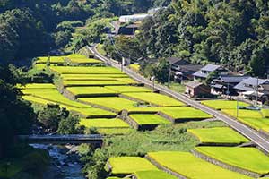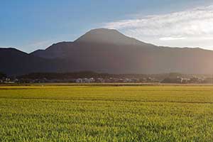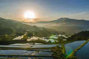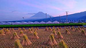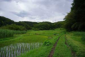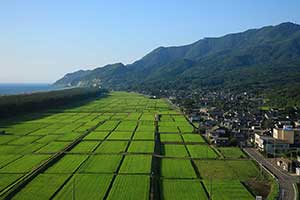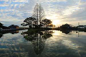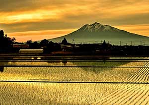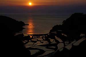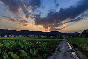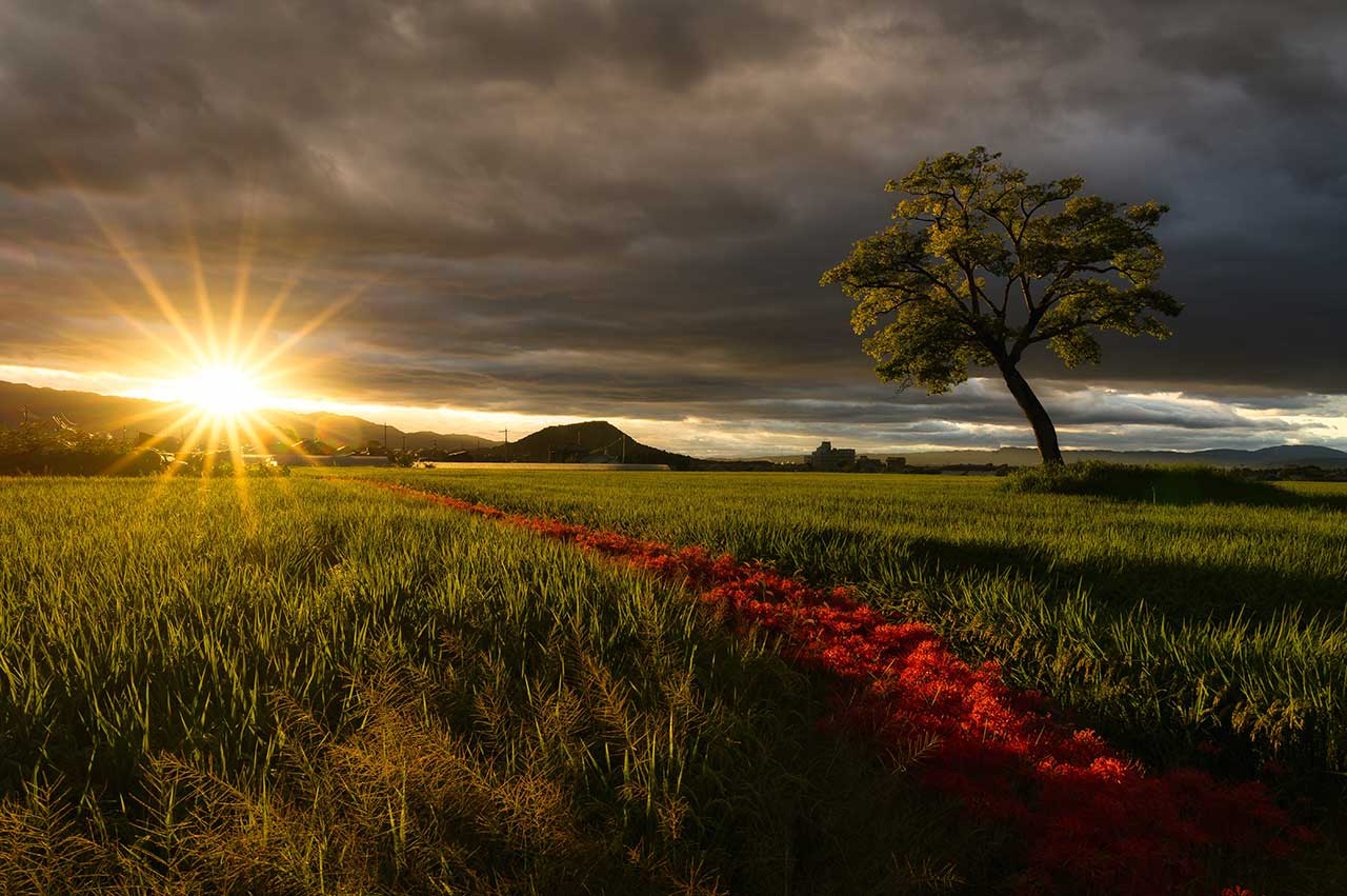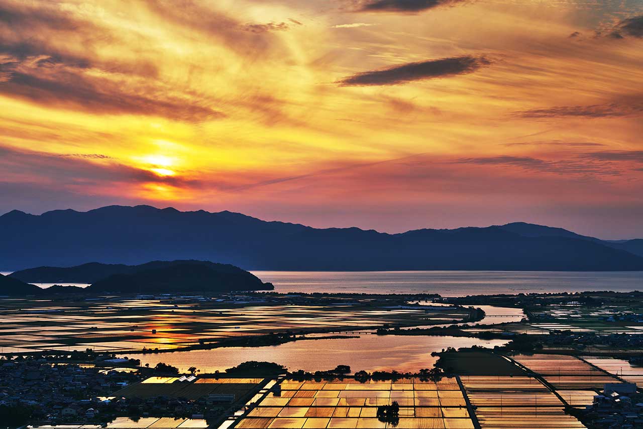 夕日を浴びる水田の輝き、光と色の美しさに感動いたします。 この写真では空の部分を狭めて水田の光の美しさだけを
