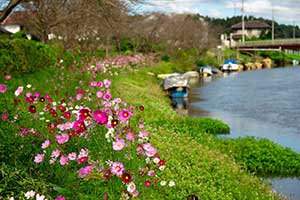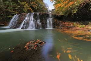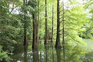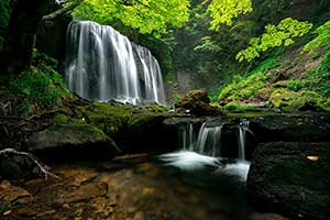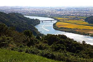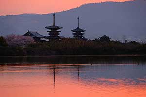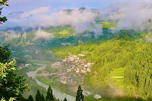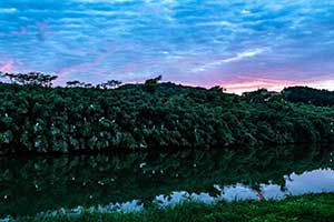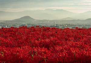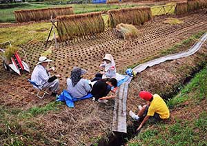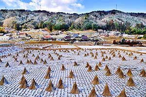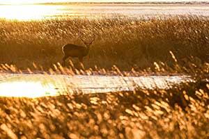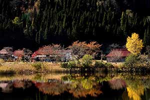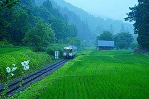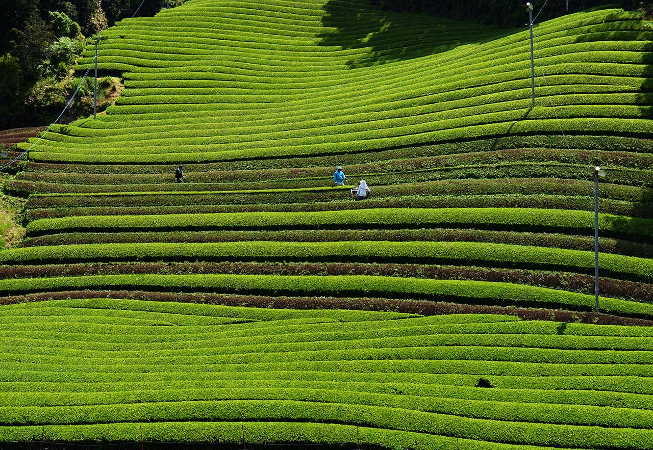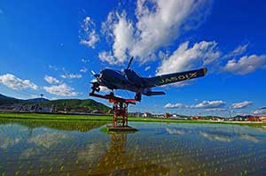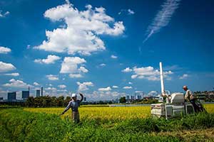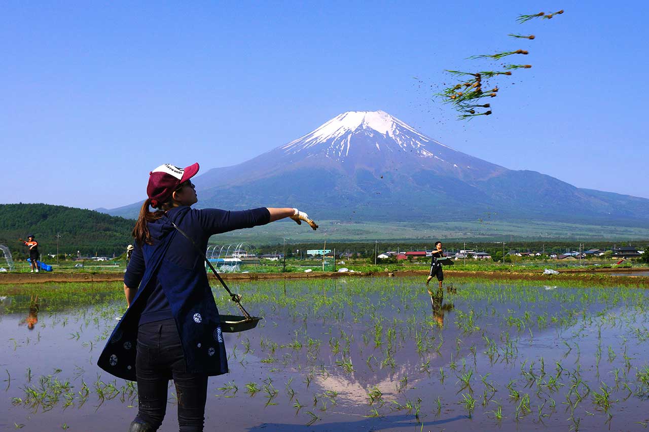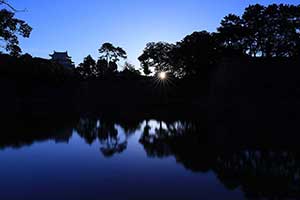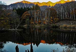 夕日を浴びる水田の輝き、光と色の美しさに感動いたします。 この写真では空の部分を狭めて水田の光の美しさだけを