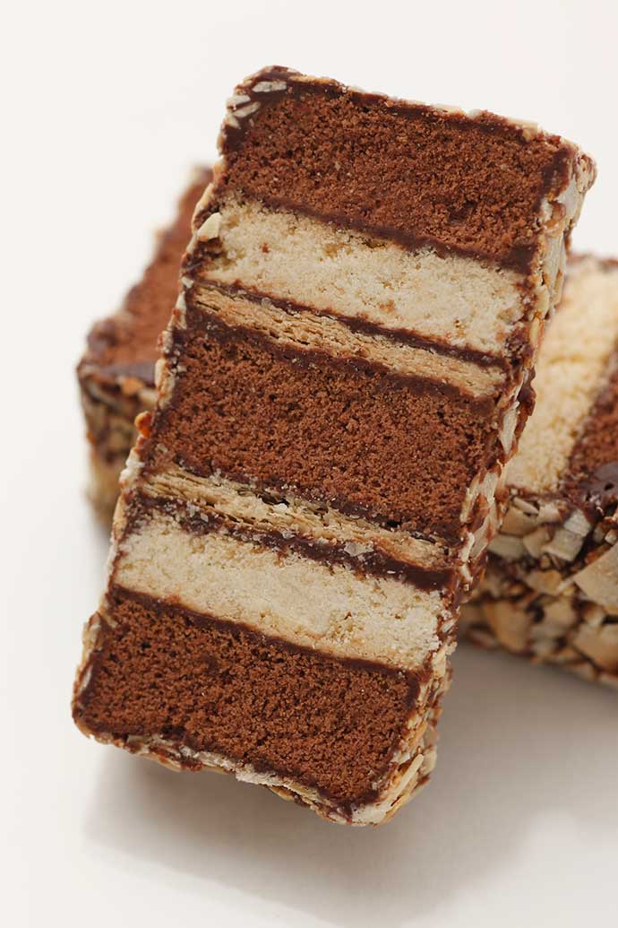 スポンジ、サブレ、フレンチパイをオリジナルブレンドのチョコレートでコーティングして7層に重ねた地層のようなお菓子。食感の楽しさと華やかさが自慢のスィーツです。