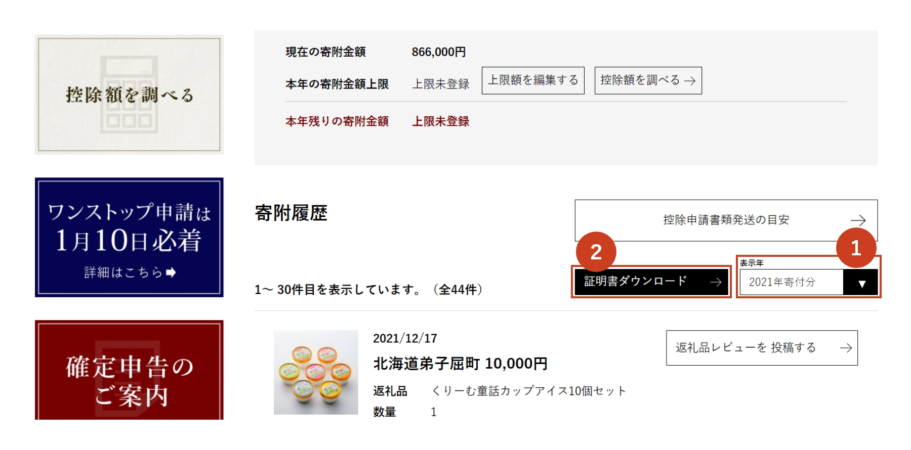 「マイページ」トップの寄附履歴の表示年から、ダウンロードしたい証明書の表示年を選択してください。